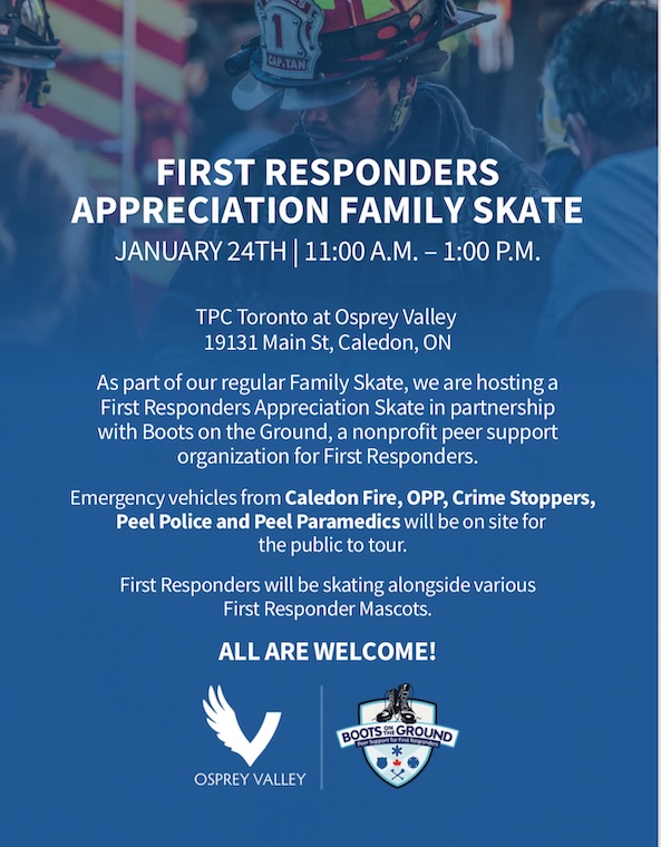 Emergency vehicles from Caledon Fire, OPP, Crime Stoppers and Peel Paramedics will be on site for the public to tour. First Responders will be skating alongside various First Responder Mascots.